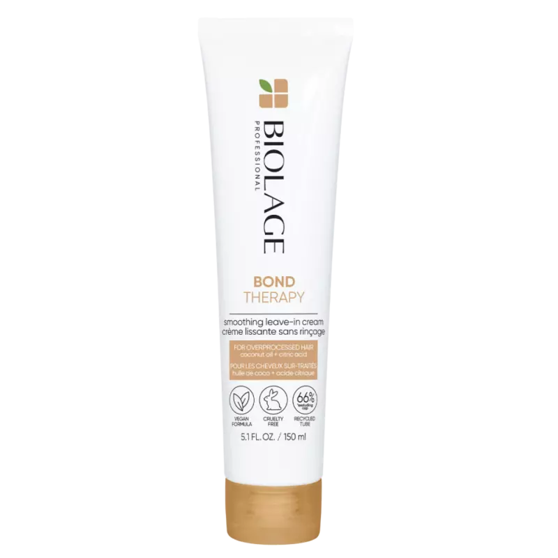 Description”: “The Biolage Bond Therapy Leave-In Cream cleanses and nourishes stressed, damaged and brittle hair types.”, “Benefits”: [“Helps to smooth the hair cuticle”, “Reduces frizz and flyaways”, “Protects against heat damage”], “How to use”: “Apply a small amount to towel-dried hair, from mid-lengths to ends. Style as usual.”, “Safety note”: “For best results, use in conjunction with other Biolage products. Avoid using on color-treated hair without consulting a professional.