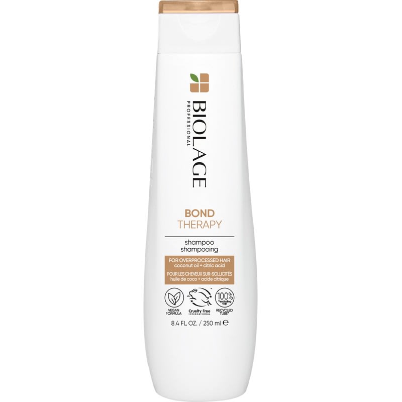 Bond Therapy Shampoo fra Biolage plejer håret og forstærker svage bindinger. Den lave pH-værdi nærer overbehandlet hår. Den reducerer knækkede hår, styrker og blødgør håret, hvilket gør håret nemmere at style. Formel med kokosolie hjælper med at blødgøre håret, og citronsyre hjælper med at forbedre styrke og hårets spændstighed.