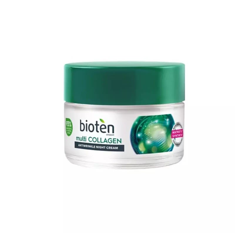 Bioten Multi Collagen Night Cream – For All Skin TypesBioten Multi Collagen Night Cream is a rejuvenating formula designed to work overnight, suitable for all skin types. Made with 97% ingredients of natural origin, it combines advanced science with nature to restore youthful radiance.Product DetailsType: Anti-Wrinkle Night CreamBrand: BiotenSize: 50mlIngredients Collagen Restorer Peptide – Stimulates three types of collagen (I, III & IV) and hyaluronic acid production to improve elasticity and reduce wrinkles. Marine Plant Collagen – A natural collagen source that helps replenish skin’s structure and firmness. Low Molecular Weight Hyaluronic Acid – Deeply hydrates, plumps, and smooths fine lines. Fruit Acids (AHAs) – Gently exfoliate to renew skin and enhance radiance. Full INCI List (as provided by Bioten): Aqua, Glycerin, Isopropyl Palmitate, Caprylic/Capric Triglyceride, Cetearyl Alcohol, Glyceryl Stearate, PEG-100 Stearate, Dimethicone, Sodium Hyaluronate, Hydrolyzed Collagen, Hydrolyzed Glycosaminoglycans, Hydrolyzed Rhodophyceae Extract, Lactobionic Acid, Citrus Limon Fruit Extract, Vaccinium Myrtillus Fruit Extract, Saccharum Officinarum Extract, Acer Saccharum Extract, Citrus Aurantium Dulcis Fruit Extract, Parfum, Phenoxyethanol, Ethylhexylglycerin, Xanthan Gum, Carbomer, Sodium Hydroxide, Disodium EDTA, CI 77891.Natural Content: 97% ingredients of natural origin Free From: Parabens, paraffins, colorantsHow to Use Cleanse your face thoroughly to remove makeup, dirt, and impurities. Apply a small amount of Bioten Multi Collagen Night Cream to your face, neck, and décolletage. Massage gently in upward, circular motions until fully absorbed. Use nightly as the last step of your evening skincare routine. Avoid the eye area for best results.