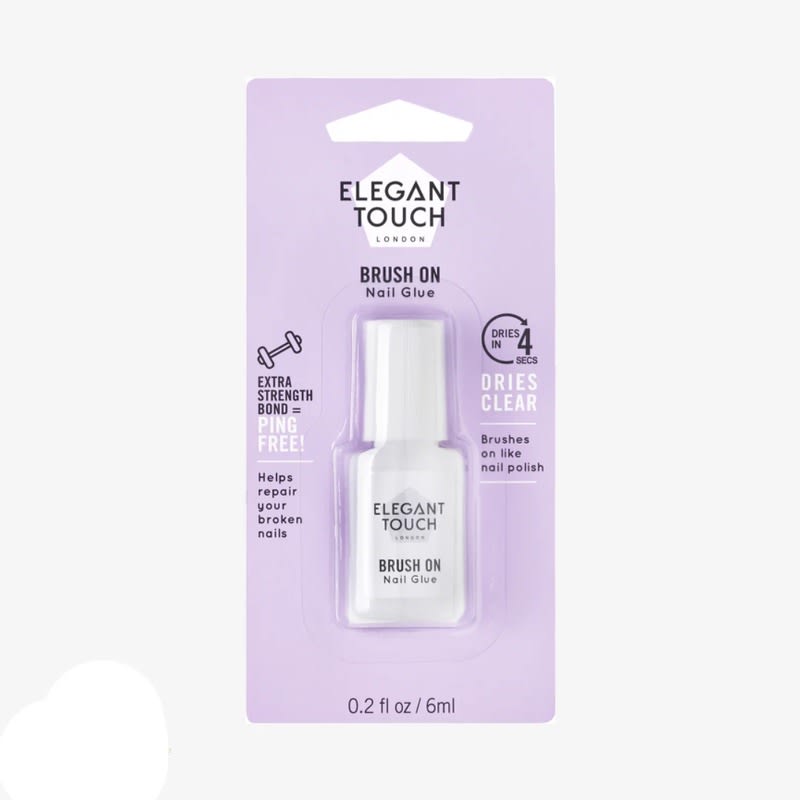 Elegant Touch Brush On Glue Nail Glue For easy-peasy glue application ‘Brush on Glue’ is your new bestie! It applies just like nail polish & dries clear in just 4 seconds –so no hanging around waiting for it to dry. It’s also great for fixing broken nails