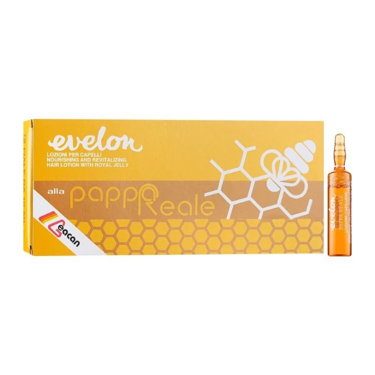 Description”: “EVELON AMBOULS FIALE PAPPA REALE 10ML 12F is a hair treatment ampoule designed to fortify and restore damaged locks.”, “Benefits”: [“Enhances scalp health”, “Fortifies hair fibers for increased strength”, “Reduces breakage and split ends”], “How to use”: “Apply 2-3 drops to the affected area, ideally on damp or dry hair. Leave it on for 10-15 minutes before rinsing with warm water.”, “Safety Note”: “For external use only. Do not apply to broken skin or open wounds. Patch test before using on a larger area.