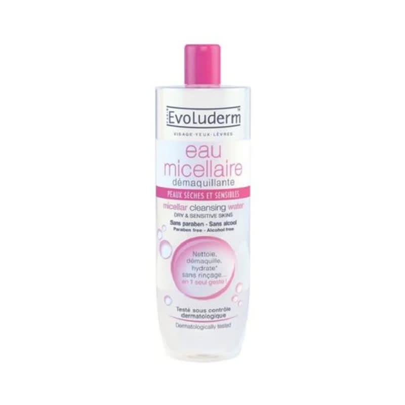 Description”: “Evoluderm Micellar Water is a gentle, effective cleanser for dry and sensitive skin. Its unique formula uses advanced micellar technology to dissolve and remove makeup, including waterproof products, without stripping the skin of its natural oils.”, “Benefits”: [“Gentle on dry and sensitive skin”, “Effective at removing waterproof makeup”, “Non-comedogenic and oil-free”, “Suitable for daily use”], “How to Use”: “Wet a cotton pad with Evoluderm Micellar Water and gently sweep across the face, repeating as needed. Pat dry with a clean towel.”, “Safety Note”: “If irritation occurs, discontinue use and consult a healthcare professional.