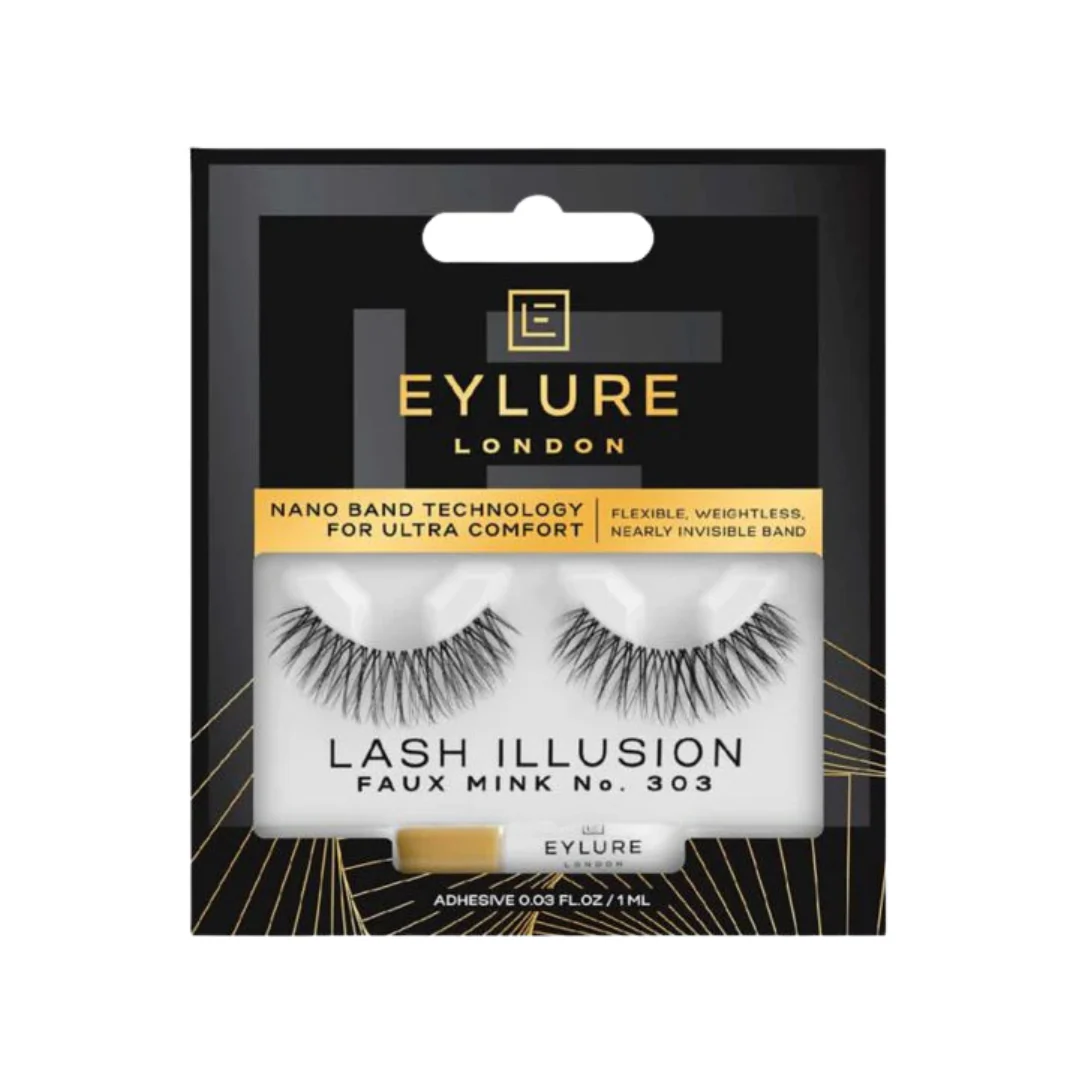 Product Description”: “Eylure Lash Illusion No. 303 Lashes are designed to add subtle texture and lift to your look, giving you a flirty and playful finish. The wispily segmented lashes create a natural, effortless look that’s perfect for everyday wear or special occasions.”, “Benefits”: [“Adds texture and lift for a subtle, flirty finish”, “Perfect for adding volume and drama to your natural lash line”, “Latex-free lash glue ensures secure application”], “How to Use”: “Before applying, gently remove any excess glue from the lashes. Apply the lash glue to the lash band and wait for 30 seconds before applying the lashes. Gently press the lashes against your natural lash line.”, “Safety Note”: “For external use only. Avoid getting the lash glue or individual lashes in your eyes. If irritation occurs, discontinue use and consult a doctor.