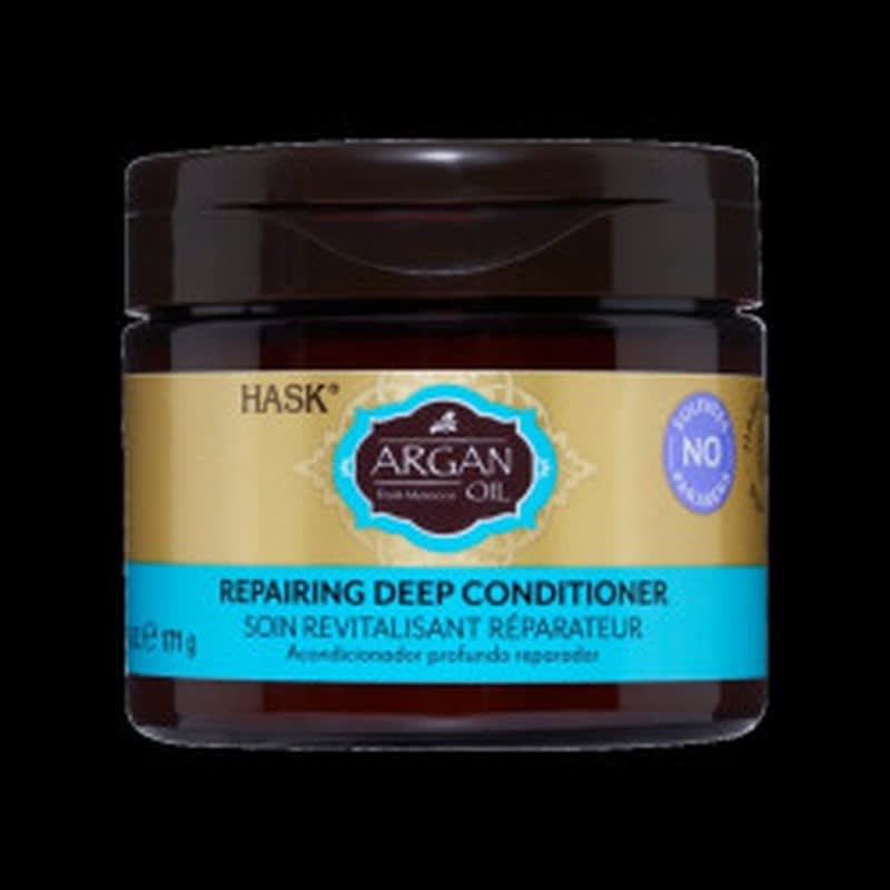 Description”: “HASK Argan Oil Repairing Deep Conditioner is a premium hair treatment that deeply nourishes and repairs dry, damaged hair.”, “Benefits”: [“Deeply moisturizes and repairs dry, brittle, or over-processed hair”, “Rich in antioxidants and essential fatty acids for healthy-looking locks”, “Can be used as a pre-shampoo treatment or as a leave-in conditioner”], “How to use”: “Apply to towel-dried hair, cover with shower cap, and leave on for 15-30 minutes. Rinse thoroughly and follow with your usual shampoo and conditioner.”, “Safety note”: “For external use only. Avoid using on damaged scalp or skin conditions. Do not apply to open wounds.
