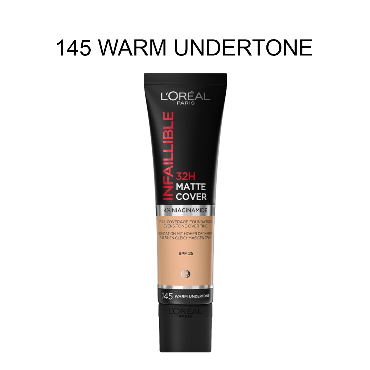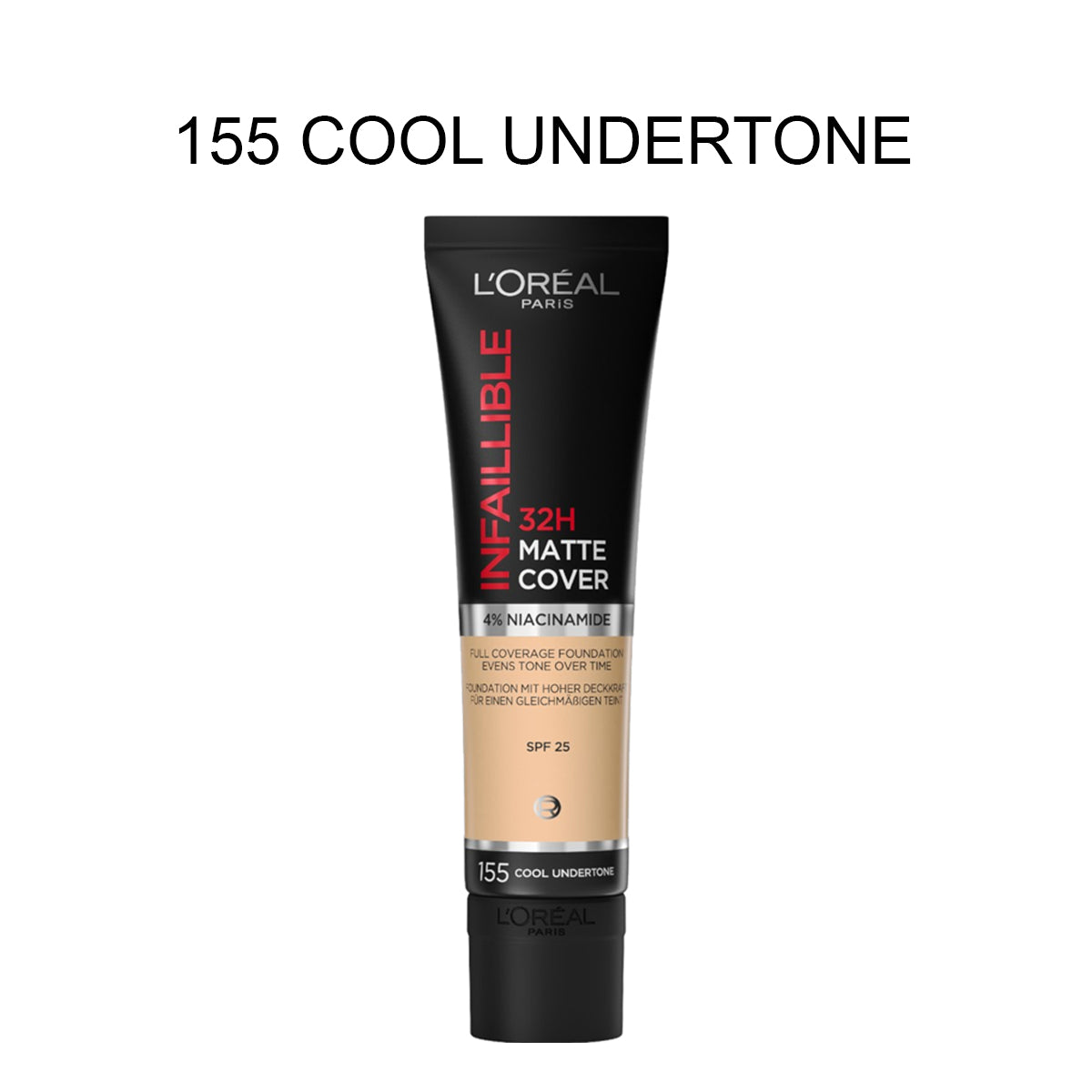 Our Infallible 32H Matte Cover foundation, created by L’Oréal Paris. A long-lasting foundation with 32H full matte coverage and a natural, second-skin finish. Formulated with 4% Niacinamide, the formula helps even skin tone. New Infallible 32H Matte Cover foundation in shade 25: created by L’Oréal Paris. A long-lasting foundation with 32H full matte coverage and a natural, second-skin finish. Formulated with 4% Niacinamide, the formula helps even skin tone. With a high-pigment concentration in a smooth fluid formula, the foundation naturally blends onto your skin for full coverage with a barely-there feel. Shine-proof, transfer-proof and waterproof. Contains SPF 25, and validated by dermatologists.
