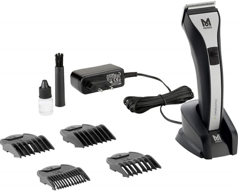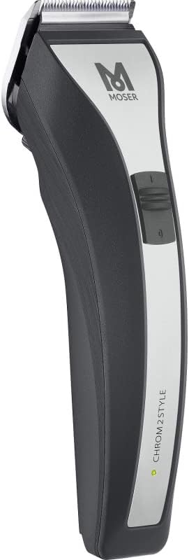 Moser Chrom2Style professional cord/cordless hair clipper has innovative carbon-coated blade set with diamond-like properties for optimized cutting performance. Easily removable blade set allows easy cleaning and quick change to optional available all-in-one blade. Cord/cordless operation, 80 minutes super quick charge, highly efficient and durable li-lon-batteries without memory effect. Up to 120 minutes of battery operating time. Chip-controlled motor for constant cutting-power irrelevant of battery-charge level or hair type. Slim, ergonomic shape. Innovative edge of the handle allows working from the wrist in a manner that is balanced and easy on the joints.