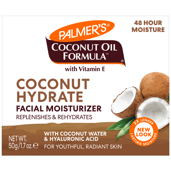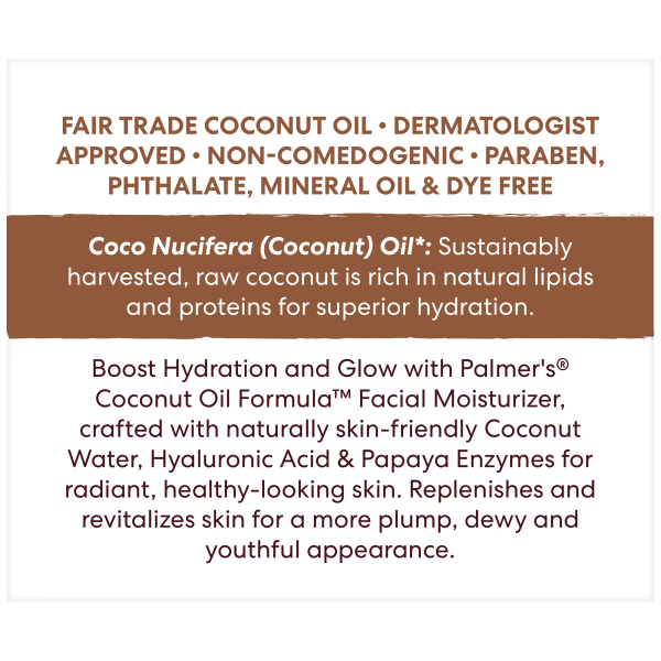 Palmer’s Coconut Hydrate Facial Moisturizer drenches skin in naturally hydrating coconut water, hyaluronic acid and papaya enzymes to revitalize and replenish skin for a healthy-looking, dewy complexion.